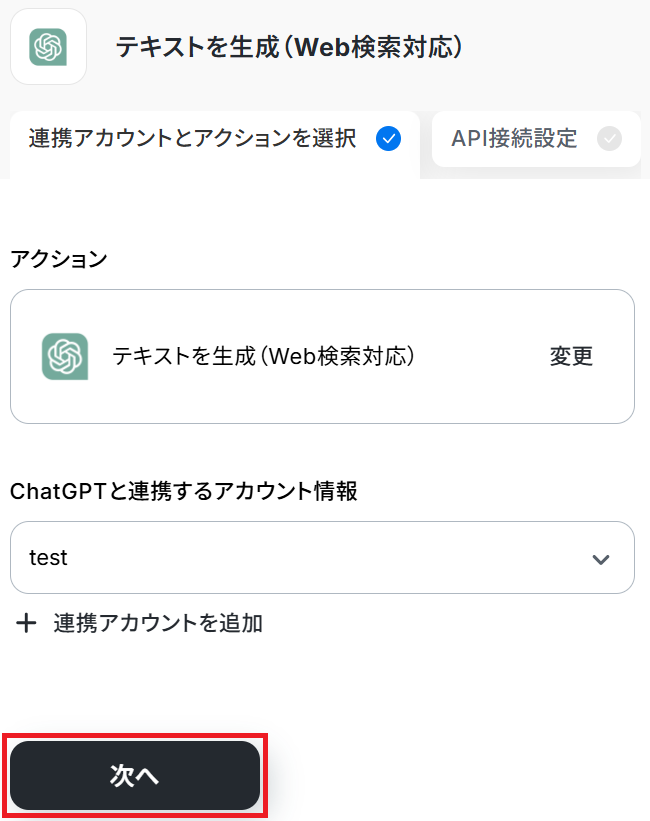 ステップ3と同様、アクションは「テキストを生成(Web検索対応)」のまま「次へ」をクリックします。