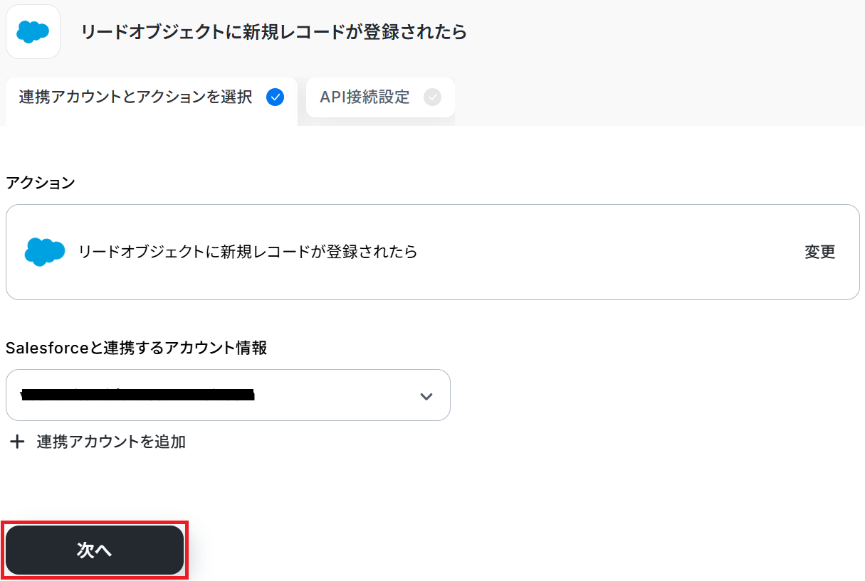 タイトルと連携するアカウント情報を任意で設定してください。トリガーアクションはテンプレート通りに「リードオブジェクトに新規レコードが登録されたら」のまま「次へ」をクリックします。