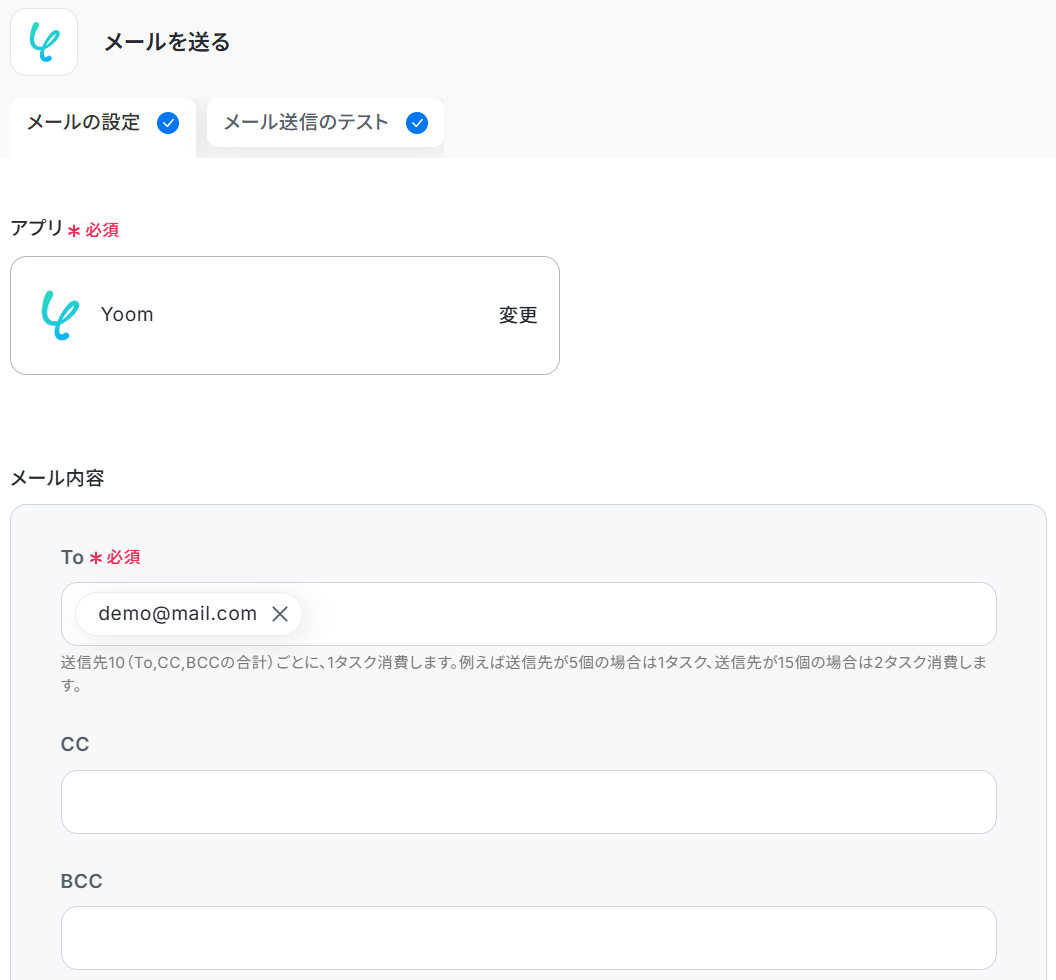 まず、Toに任意のメールアドレスを入力しましょう。CC・BCCの設定もできます。