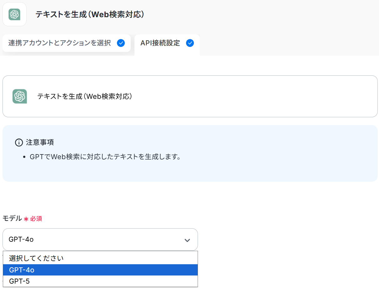 - 続いて、オペレーションでChatGPTを選択し、「テキストを生成(Web検索対応)」アクションでリード調査レポートを作成します。