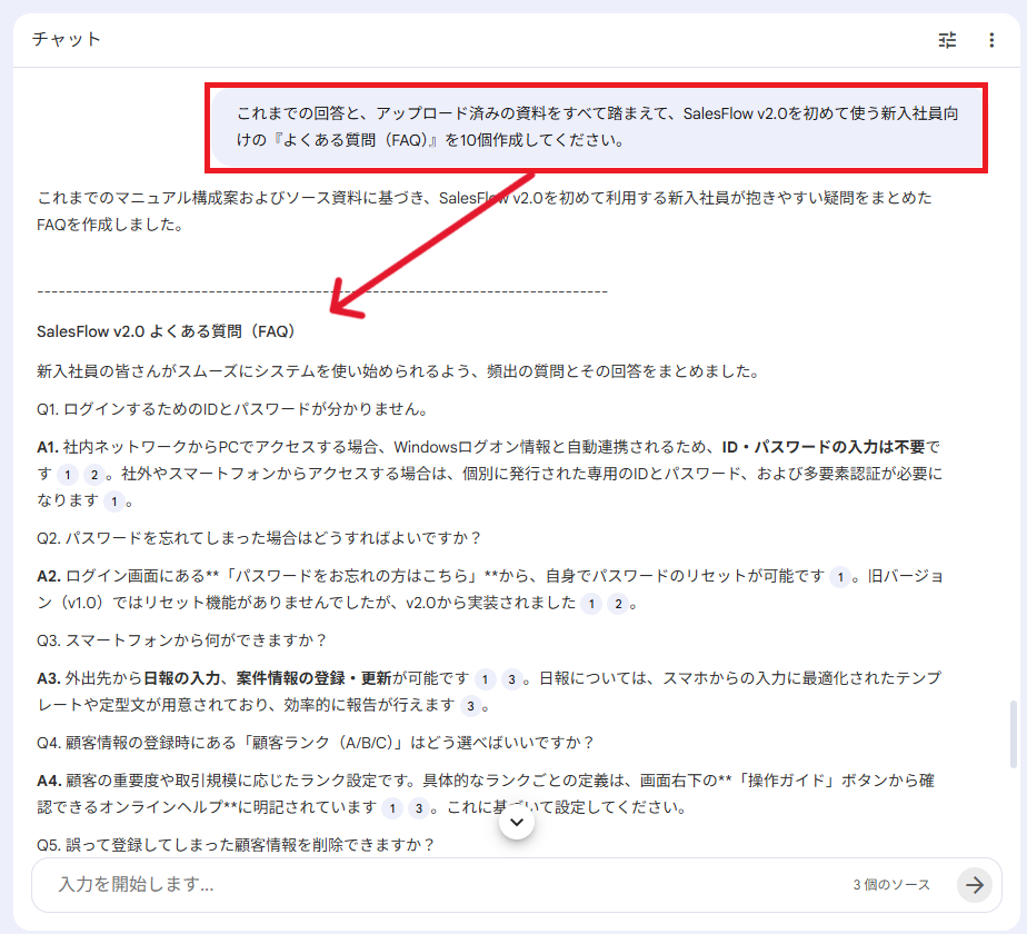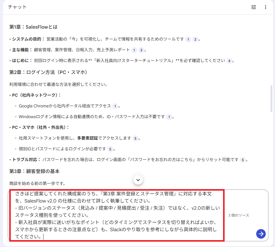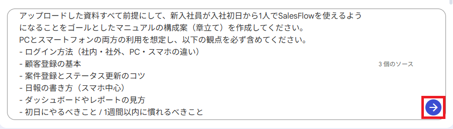 例えば「これらの資料を基に、新入社員が1人でシステムを操作できるようなマニュアルの構成案を作ってください」と伝えます。AIが章立てや必要な項目を瞬時に提案してくれます。