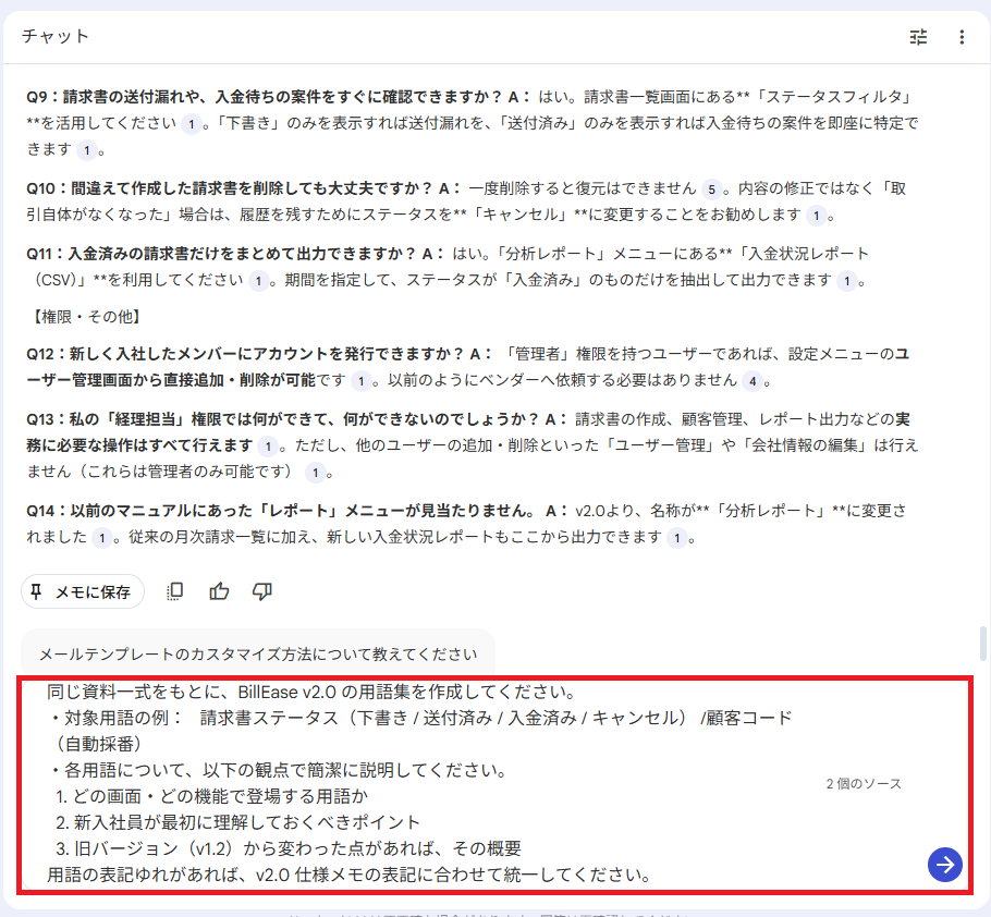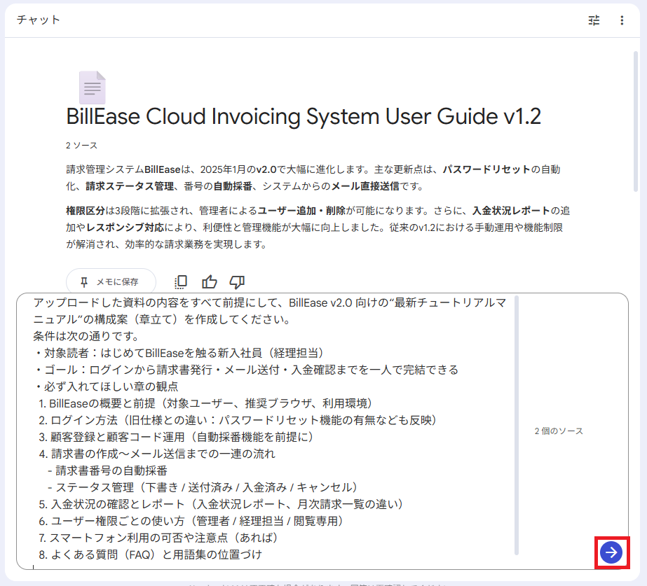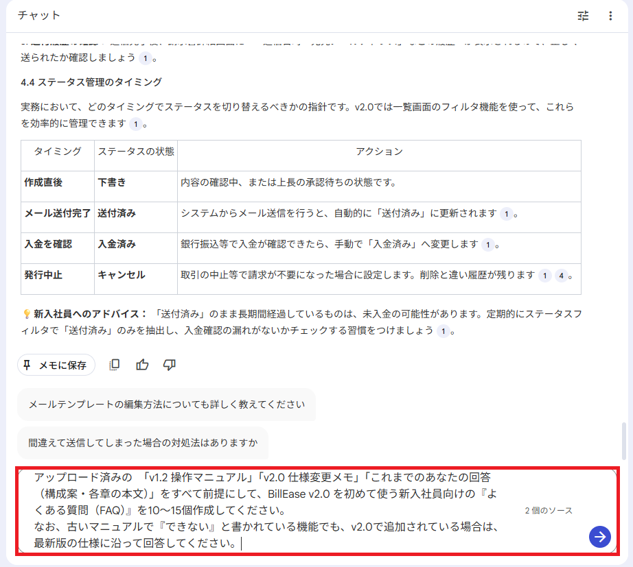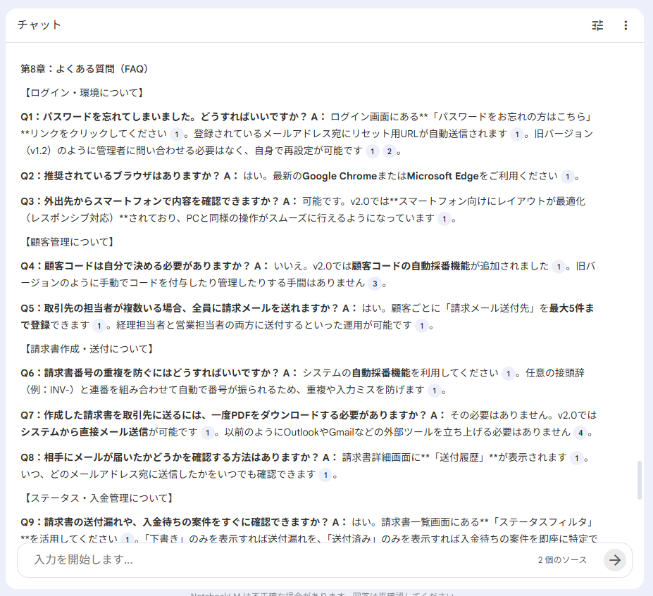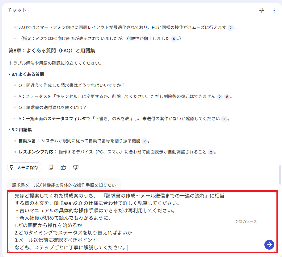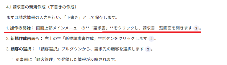 『請求書の作成〜メール送信』の章を具体的に執筆させたところ、マニュアルとして即戦力の精度を確認できました。