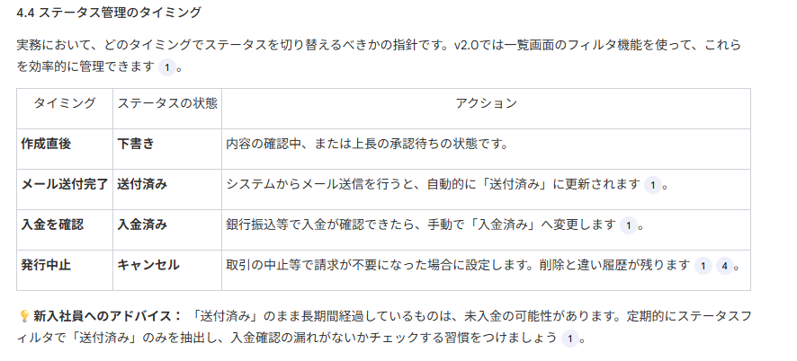 また、「どのタイミングでステータスを『送付済み』に切り替えるか」といった、操作の「意味」まで踏み込んだ解説がなされています。