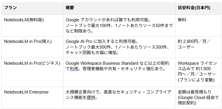 NotebookLMは、個人向け・ビジネス向けで大きく分けて「無料版」と「有料版(Pro / Enterprise)」があり、有料版は他の Google サブスクリプションに含まれる形で提供されています。