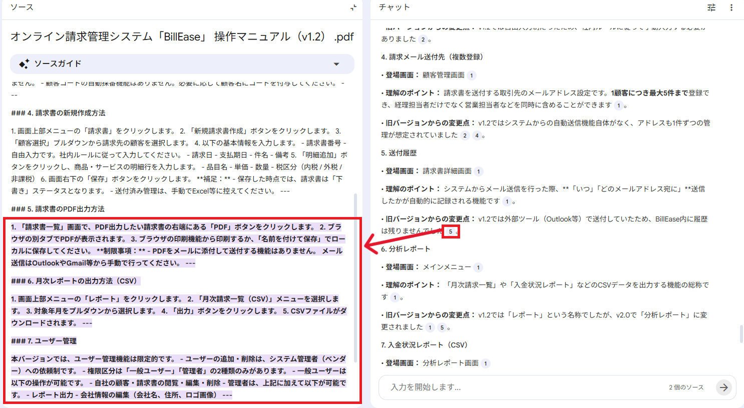 更に、 NotebookLMの強みである「ワンクリックでソースの該当箇所を確認できる」機能により、情報の正確性を担保した運用が可能です。