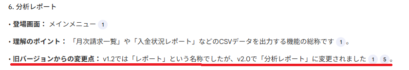 また、「v1.2ではレポートだったが、v2.0では分析レポートになった」といった変更の経緯も併記されています。
