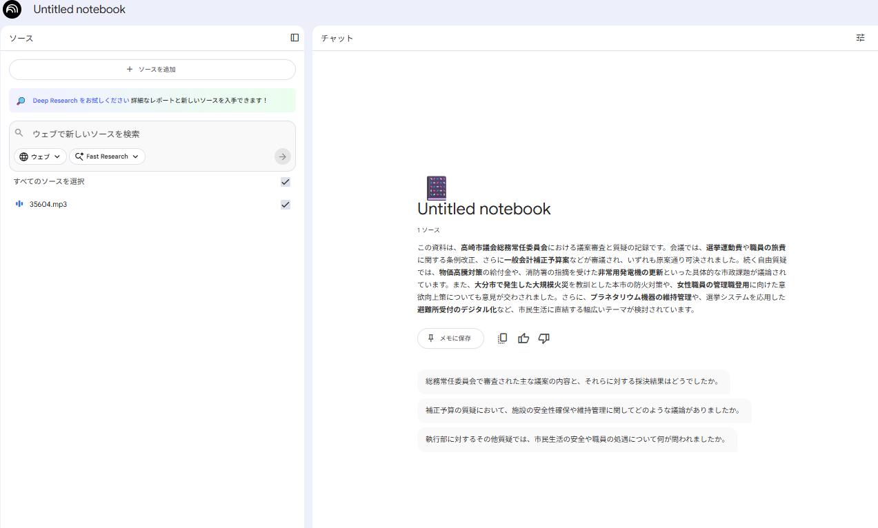 • 会議の進行とルール : 委員会の開会宣言や、委員1人あたりの発言時間を15分程度とする規則の確認が行われています。 • 議案の審議と採決 : 議案第128号から第144号(補正予算を含む)までの審議が行われ、すべての議案が起立全員で原案通り可決される過程が記録されています。 • 各委員による具体的な質疑 :◦ 中島委員 : 倉渕子ども天文台の修繕内容や、大分市での大規模火災を受けた本市の教訓について質問しています。 ◦ 青木委員 : 牛ドリームセンターの非常用発電機が故障した経緯について確認しています。 ◦ 伊藤委員 : 物価高騰対策としての国の交付金の活用方針について質疑しています。 ◦ 新倉委員 : 選挙の投票率向上と、入場券を忘れた際の本人確認方法について質問しています。 ◦ 荒木委員 : 少年科学館のプラネタリウムの維持管理や、職員の駐車場等の導入、女性職員の管理職登用への意欲向上について多角的に質問しています-。 ◦ 副委員長 : ガソリン暫定税率廃止による減収影響や、避難所受付システムのデジタル化について質疑を行っています まずはNotebook LMを開きましょう。Google アカウントを使ってログインするだけで無料で利用できます。「+ノートブックを新規作成」をクリックして、ソースに準備しておいた音声データをいれます。
