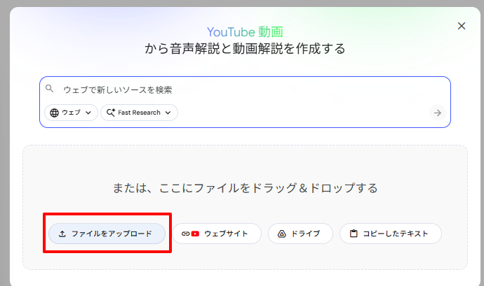 入力形式 :テキストだけでなく、音声ファイル(mp3/wav)やYouTube動画、Googleスライドなど多岐に対応。