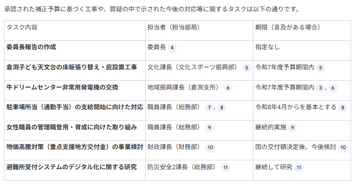 この会議の音声データから、決定事項を箇条書きでリストアップし、それぞれのタスクについて担当者と期限(言及されている場合)を表形式でまとめてください。 出力結果をもとに、情報の抜け漏れや誤認識、不要な補完が発生していないかを総合的に評価しました。 今回検証用に準備したデータは、高崎市の公式HPで公開されている総務常任委員会の音声で約30分の長さがあります。(※1)