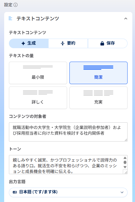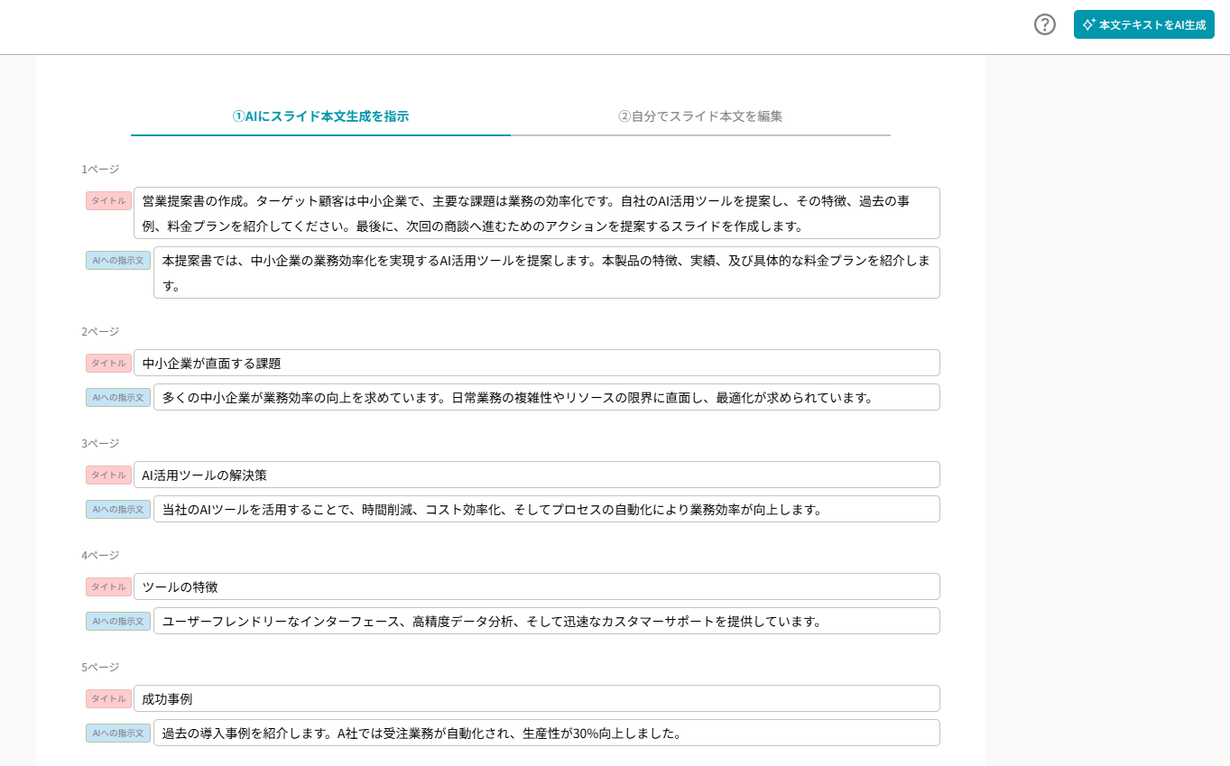 準備ができたら「本文テキストをAI生成」→「スライドへ反映」をクリックするだけで作業は完了です。