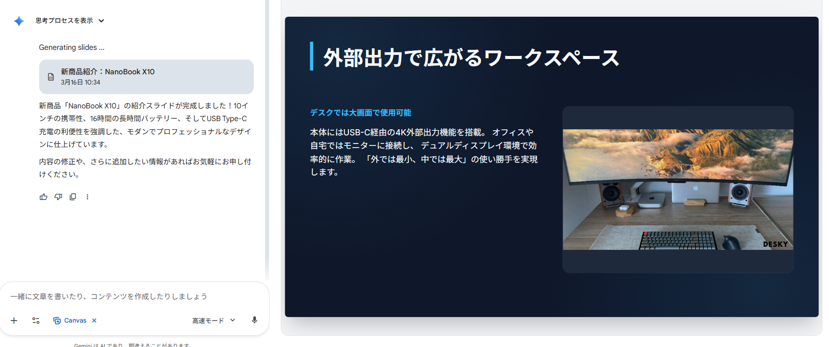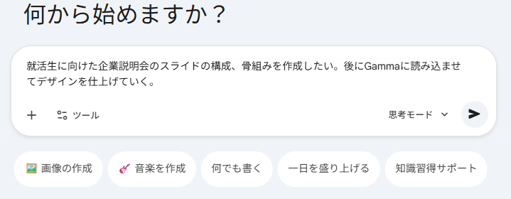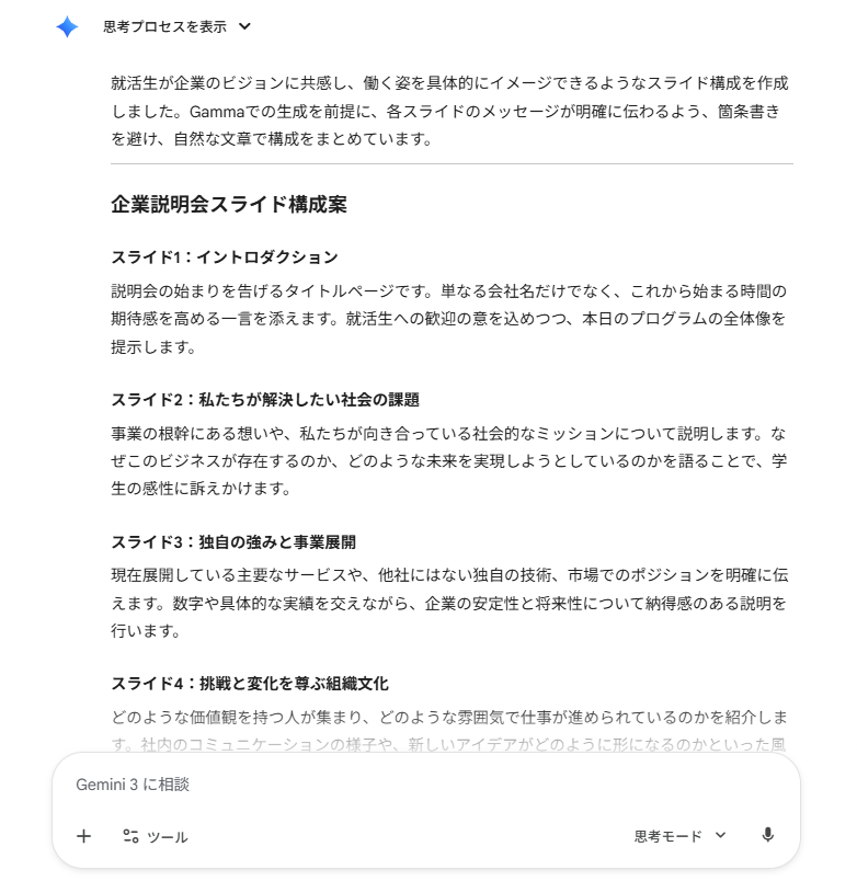 Geminiに、作成したいスライドの概要を投げることで、論理的で説得力のあるプレゼン構成を生成させることが可能です。