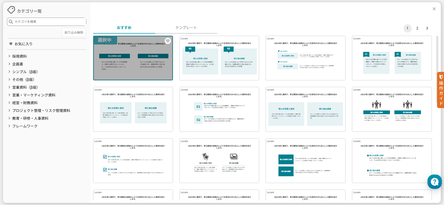 企画書や新商品紹介などの目的を選択するだけで、直感的に高品質なスライドを作成できるため、AIツールを初めて試す方にもぴったりです。