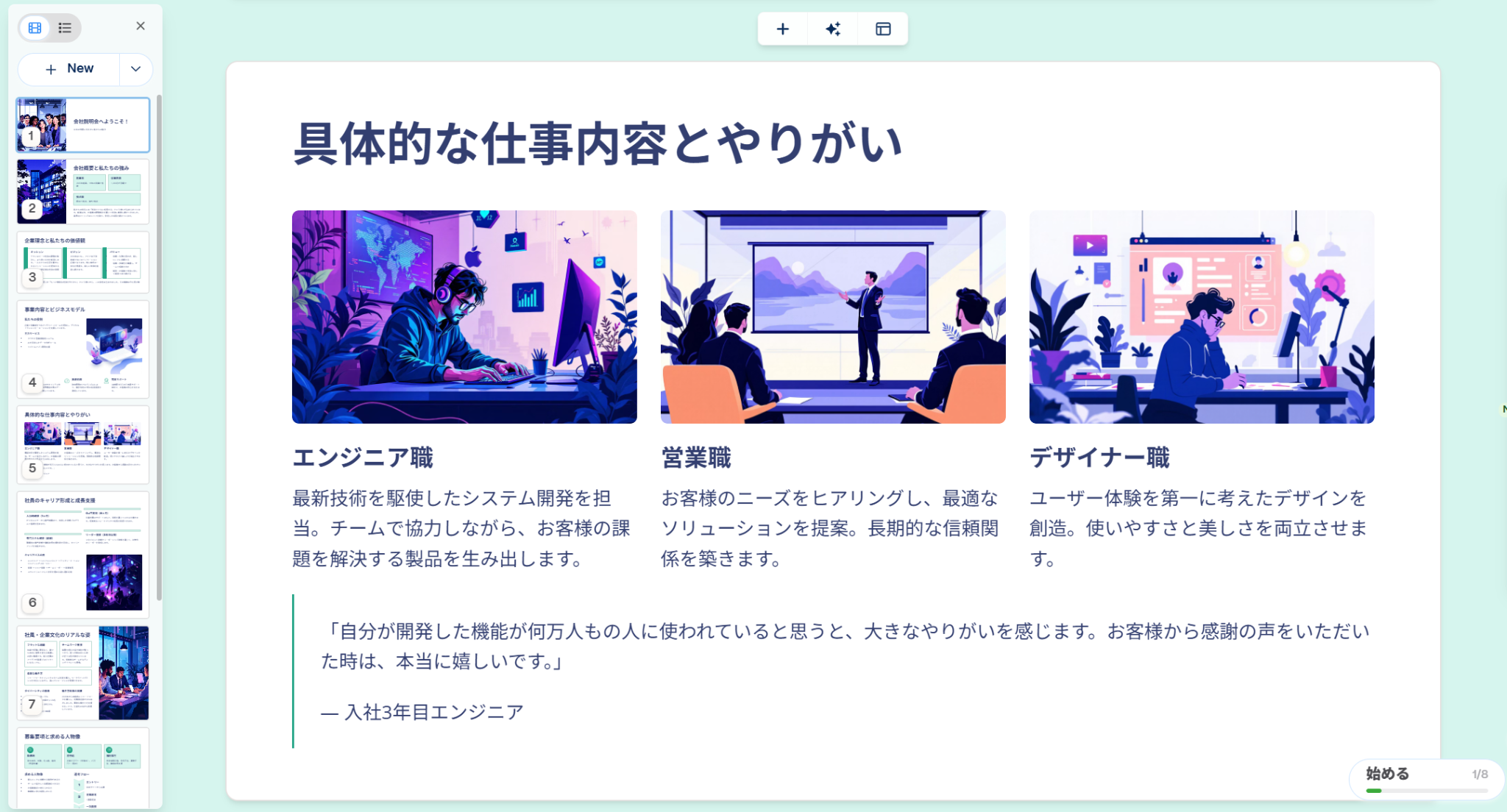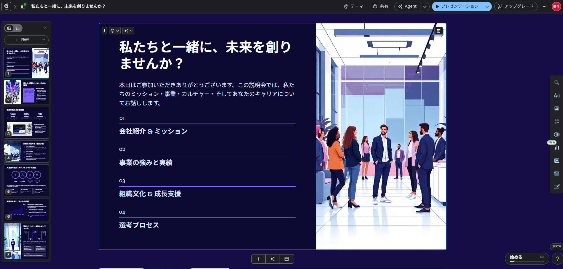 また、デザインに関する細かい編集も可能なため、洗練されたスライドを作り上げていくことも可能です。