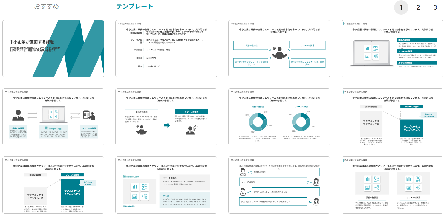 スライド出力後もテンプレートを切り替えるとスムーズにスライドのデザインが切り替えられる点もわかりやすく、スライドの修正についても直感的に操作できるので、スライド作成初心者でもスムーズに作業を進められると感じました。