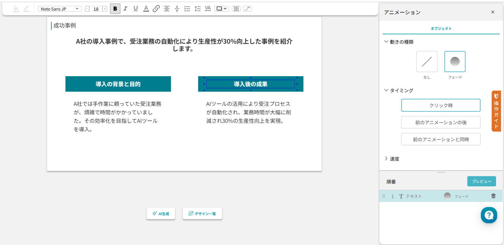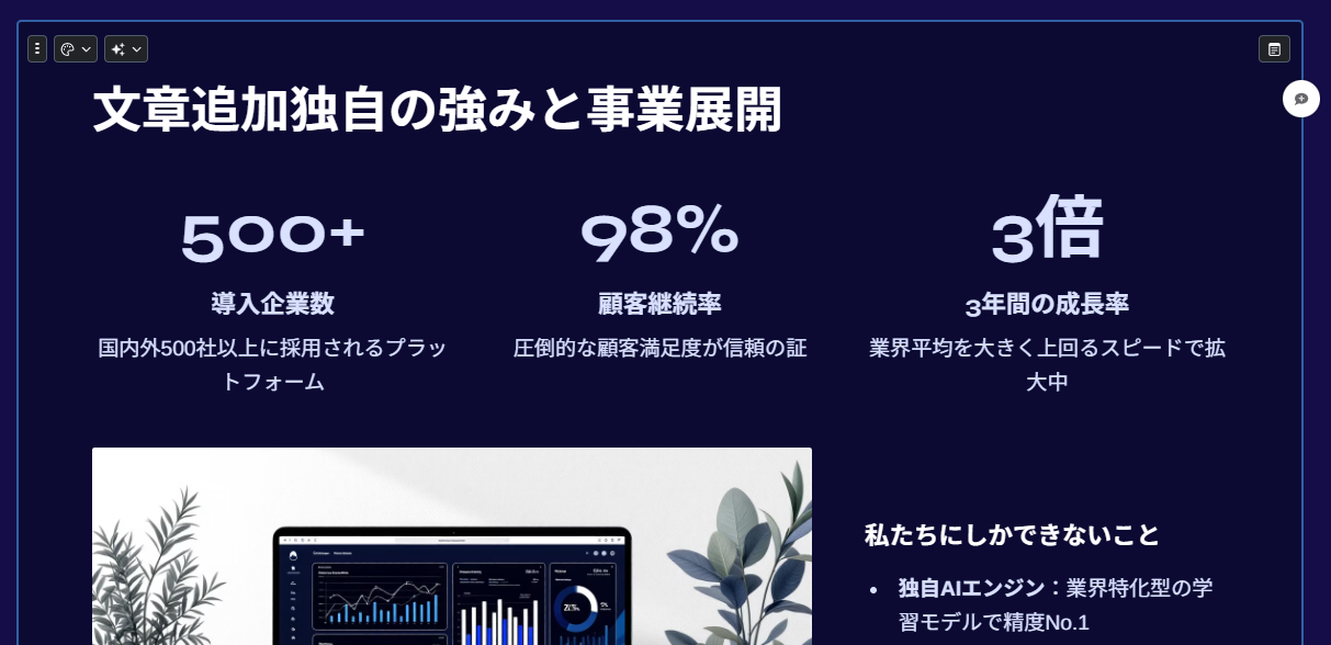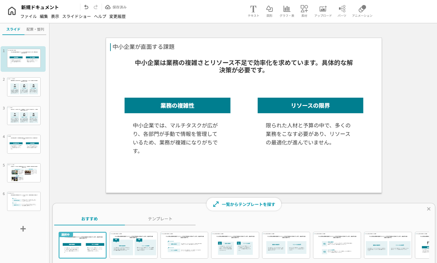 サイト上でそのままスライドの編集ができるため、文章の追加やアニメーションの追加などもシームレスに行うことができます。