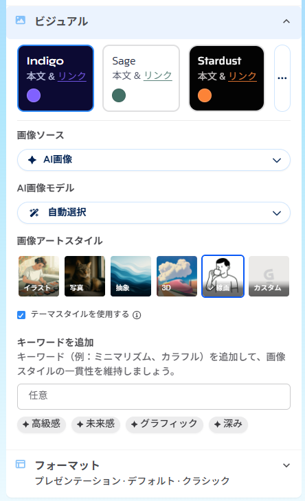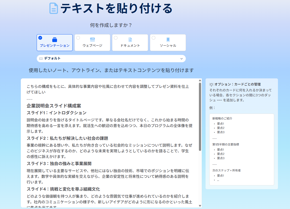 その後、生成した構成案をGammaに流し込み、デザイン面を担当させていきます。
