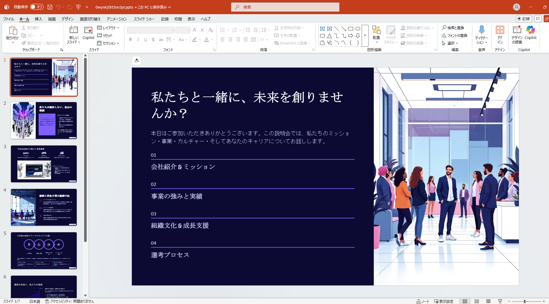 下記のようにスライドの構成案を提示してくれました。