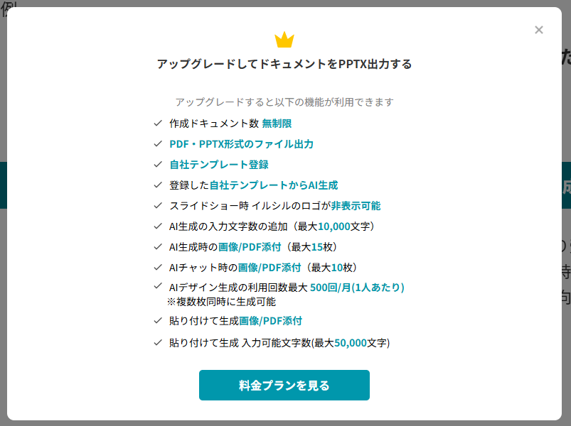 ただし、パワーポイント形式での出力や、作成できるドキュメント数に上限があるなど、無料プランでは対応していない機能も多くあるため、必要に応じてプランのアップグレードが必要になります。