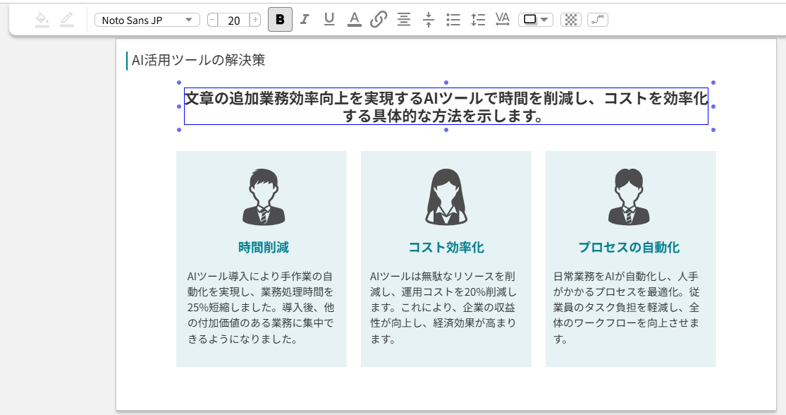 手作業で作成するよりもはるかに効率的で、しかも完成度が高い資料が短時間で作成できることに驚きました。