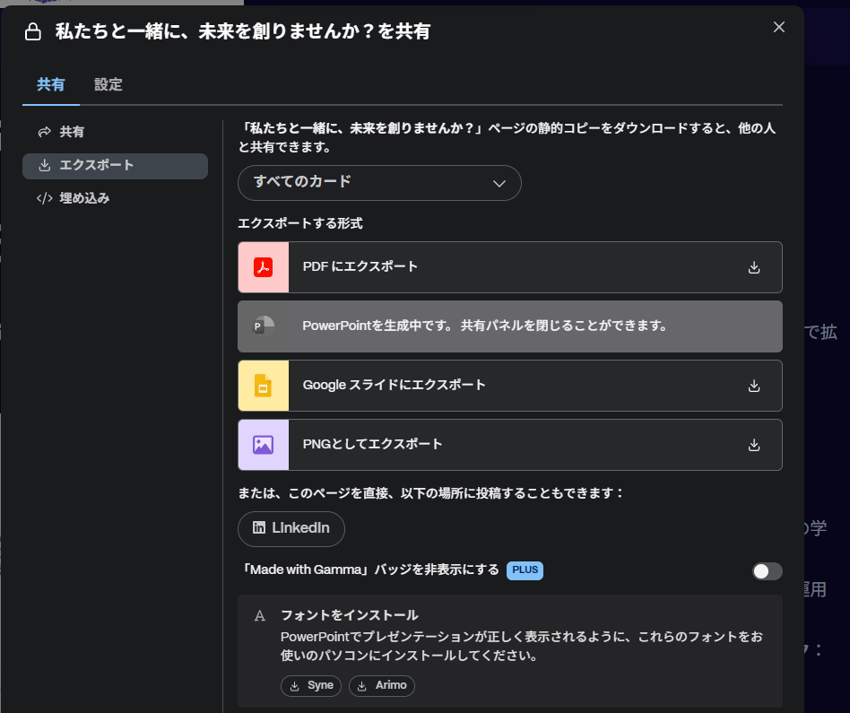 また、GammaからPowerPoint形式でのエクスポートは無料プランでも実施可能でした。ユーザーが慣れている環境を使用してスライドを仕上げていくことができそうです。