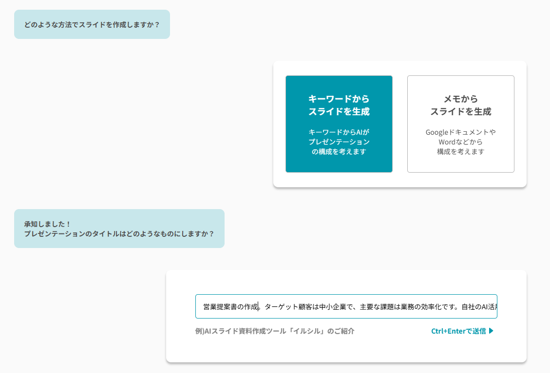初めにチャットベースでどんなスライドを作成するのかを伝えていきます。