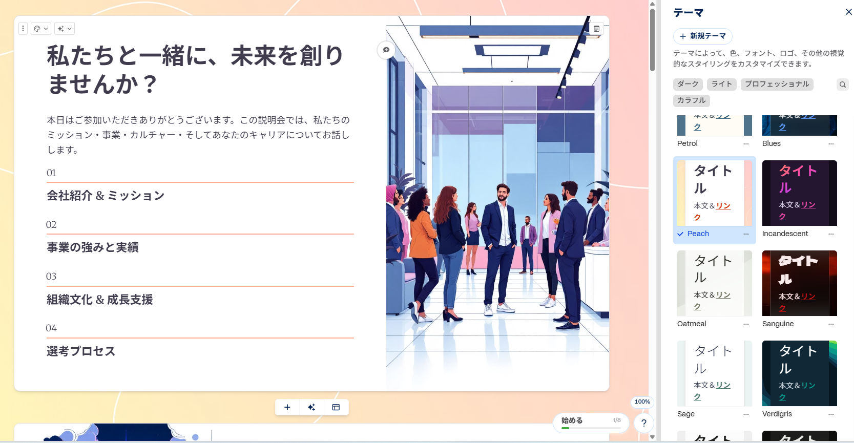 Gammaでもブラウザ上でテキストの修正や、全体のテーマの変更ができます。
