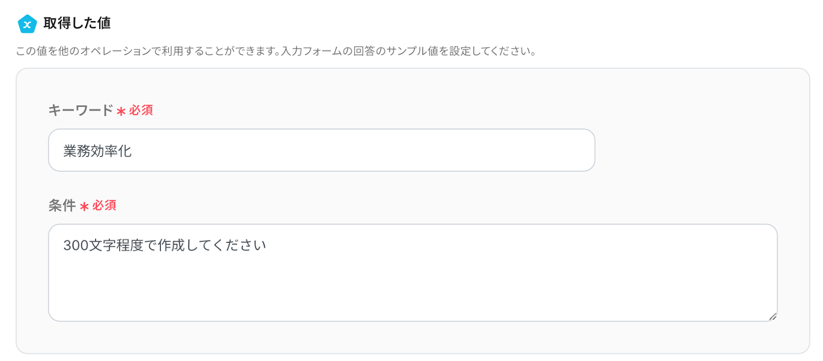 次に「取得した値」を、入力してください。