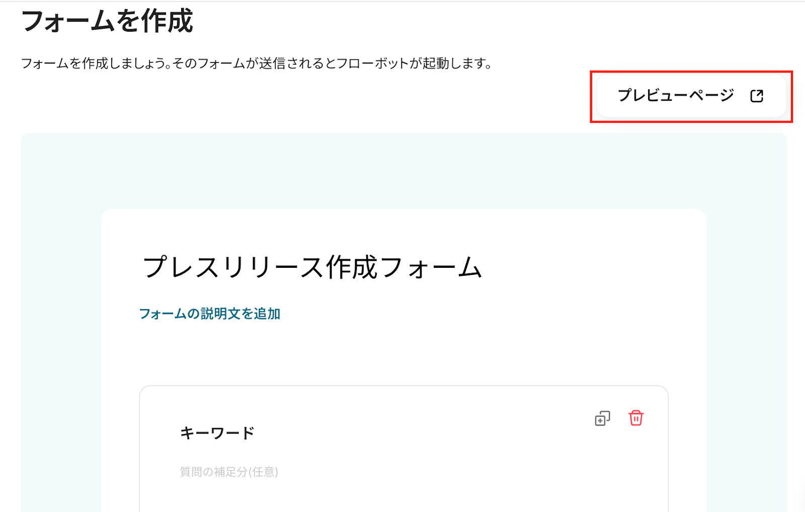 ここでは、プレスリリースを作成するための質問がすでに設定されていますが、フォームのタイトルや質問項目など、自由にカスタマイズも可能です。