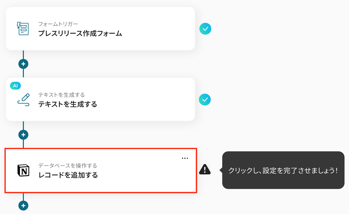 以上で、【フォームから送信された内容を元にAIでプレスリリースを作成し、Notionに追加する】フローの完成です!お疲れ様でした。