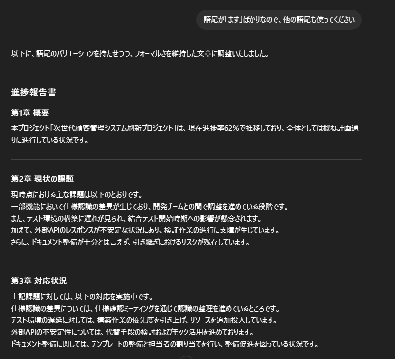 自社の文体や読み手に合わせて表現を整えると、実務的で読みやすい報告書に仕上がります。