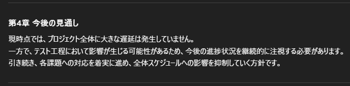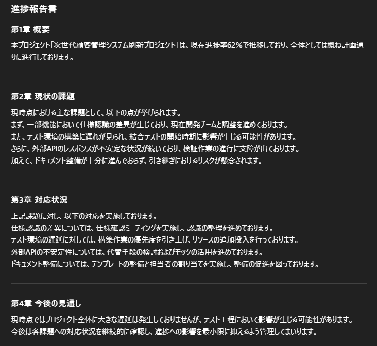 すると、報告書全体の目次や流れを短時間で整理して出力されました。