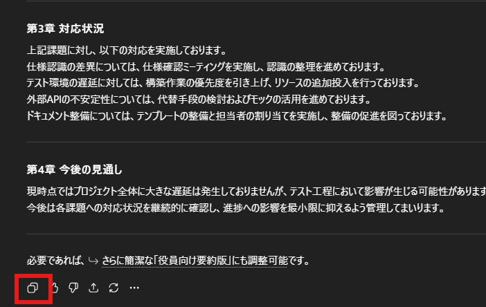 作った報告書は回答下のコピーボタンからコピーできます。書式を保ったままGoogleドキュメントなどに貼り付けることが可能です。