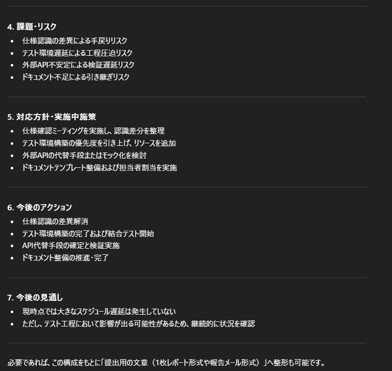 この流れを取ることで、ゼロから手作業で書くよりも短時間で、一定の品質を保った報告書を作成しやすくなります。