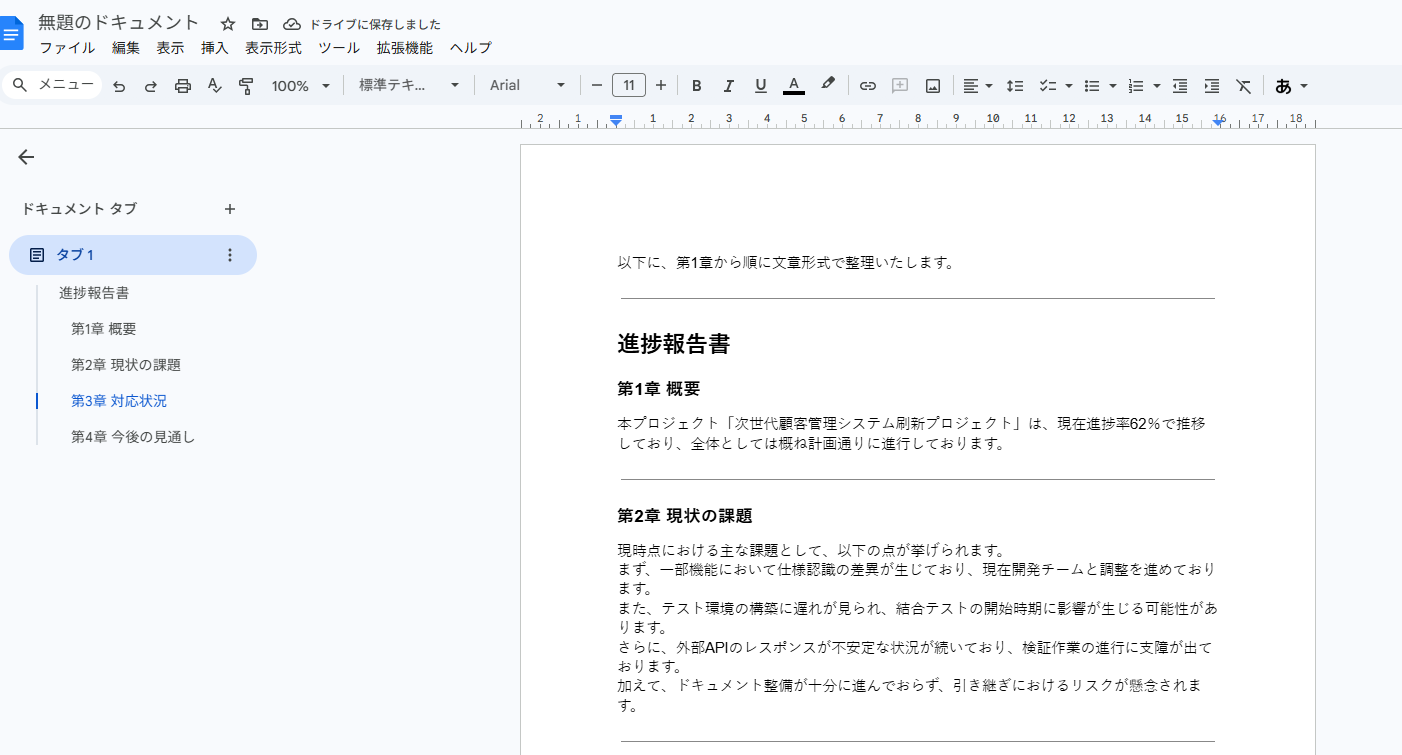 「この内容をもとに進捗報告書の構成案を作成してください」