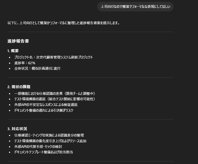 - 「上司向けなので簡潔でフォーマルな表現にしてほしい」