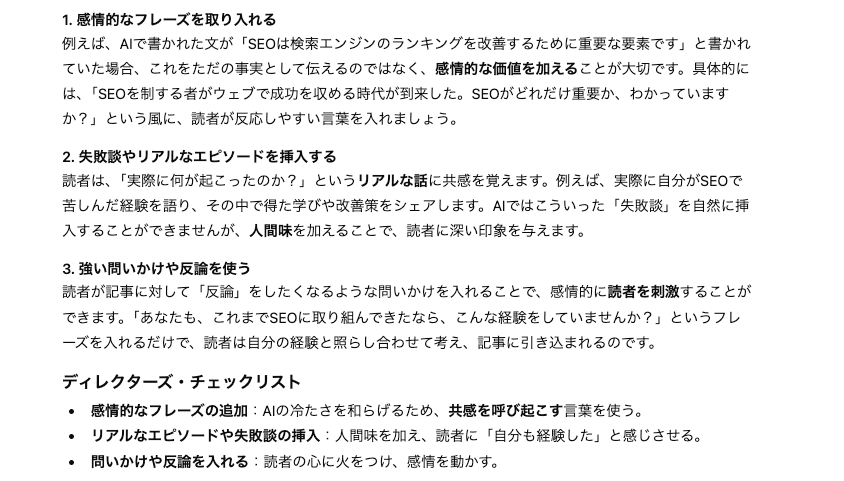 ・抽象的なアドバイス(例:リライトする)ではなく、具体的な手法(例:この部分に、あえてAIには書けない『失敗談』を300文字挿入する)を提示してください。