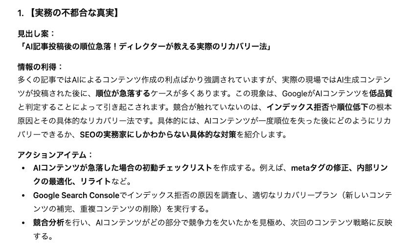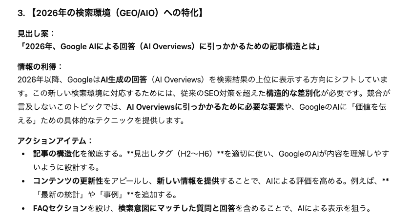 検証の結果、上位記事を学習させ不足情報を逆説的に推論させることで、現場の生々しい悩みや最新環境(AIOなど)に即した独自視点を抽出できます。