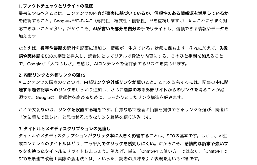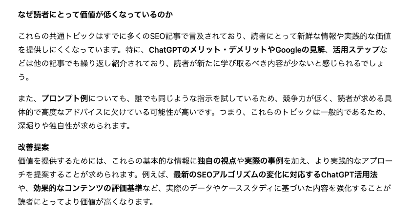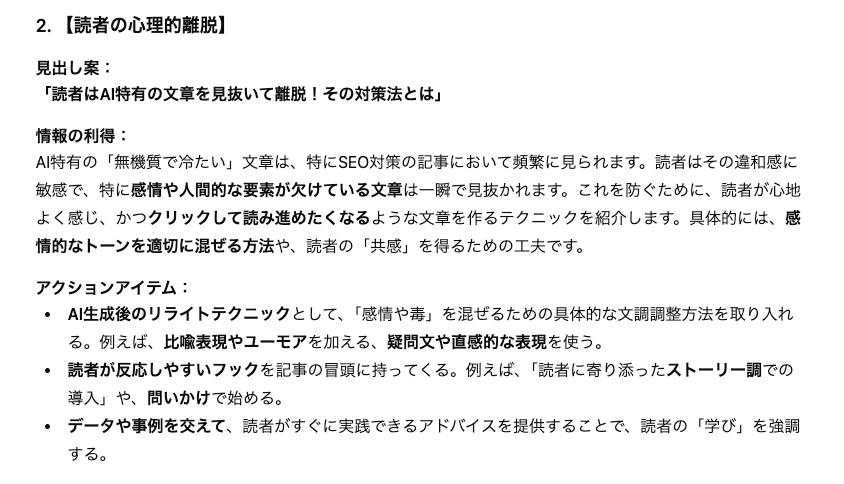 ただし、アクションアイテムがまだ「適切なタグを使う」「リライトする」といった教科書的な表現に留まっています。