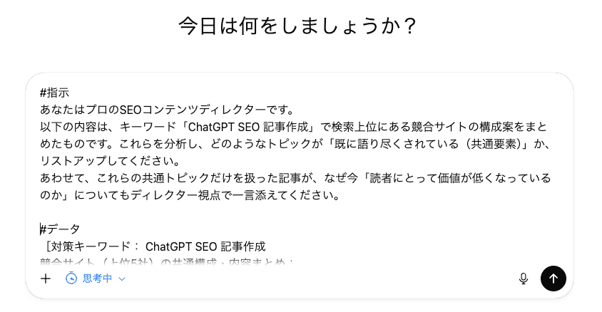 次は、AIに「競合が書けない、尖った独自視点」を出させるプロンプトを実行します。