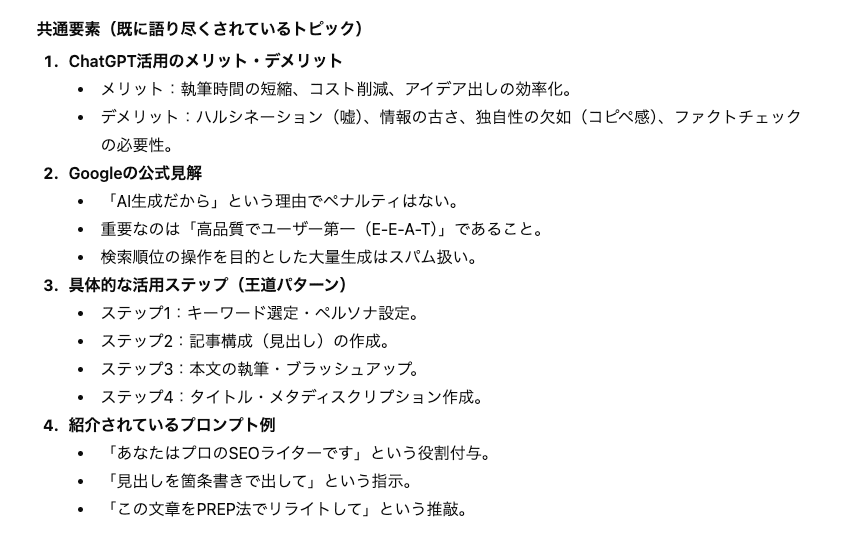 以下の内容は、キーワード「ChatGPT SEO 記事作成」で検索上位にある競合サイトの構成案をまとめたものです。これらを分析し、どのようなトピックが「既に語り尽くされている(共通要素)」か、リストアップしてください。