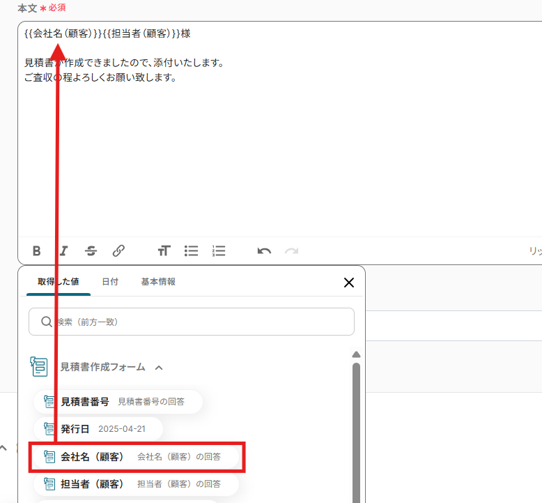 宛先や本文には見積書作成フォームで取得したアウトプットを活用できます。