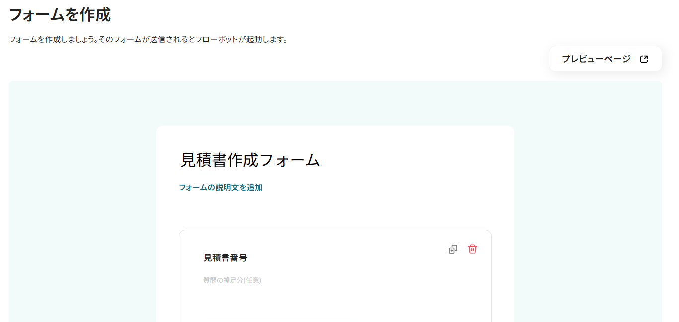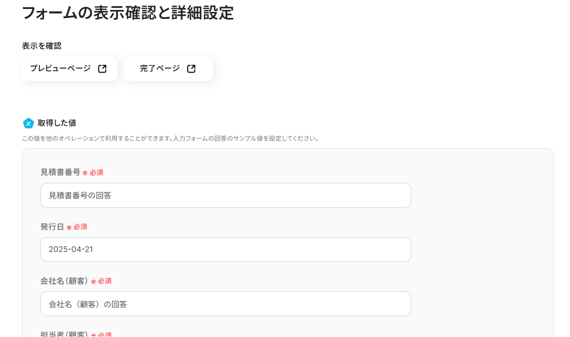 今回は、見積書番号・発行日・会社名(顧客)・担当者(顧客)・住所(顧客)・電話番号(顧客)・メールアドレス(顧客)などを回答してもらうフォームを作成しています。