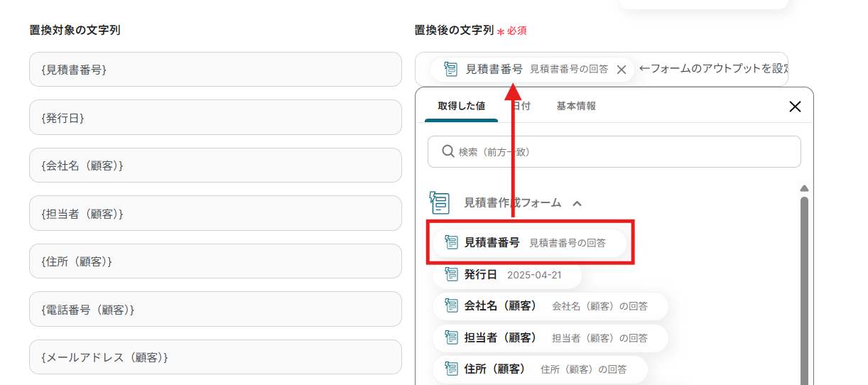 「置換対象の文字列」には作成した見積書の置換部分が記載されているので、「置換後の文字列」には出力ファイル名と同様に見積書作成フォームのアウトプットから該当する情報を選択して入力します。