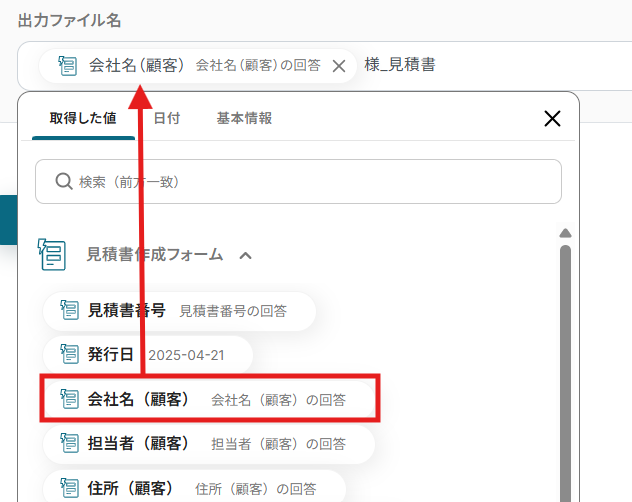 出力ファイル名にはぜひ見積書作成フォームで取得したアウトプットを活用して入力してくださいね!