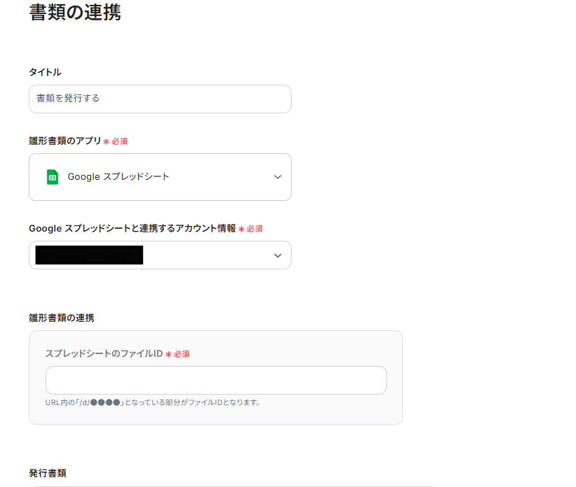 2) アクションは「書類を発行する」が選択されていることを確認し、「ドキュメントのファイルID」を入力します。