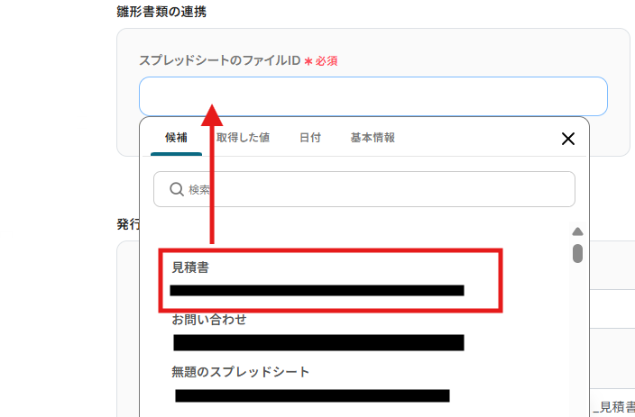雛形書類の連携はボックスをクリックすると連携済みのIDが表示されるので、事前に用意した見積書のIDを選択してください。