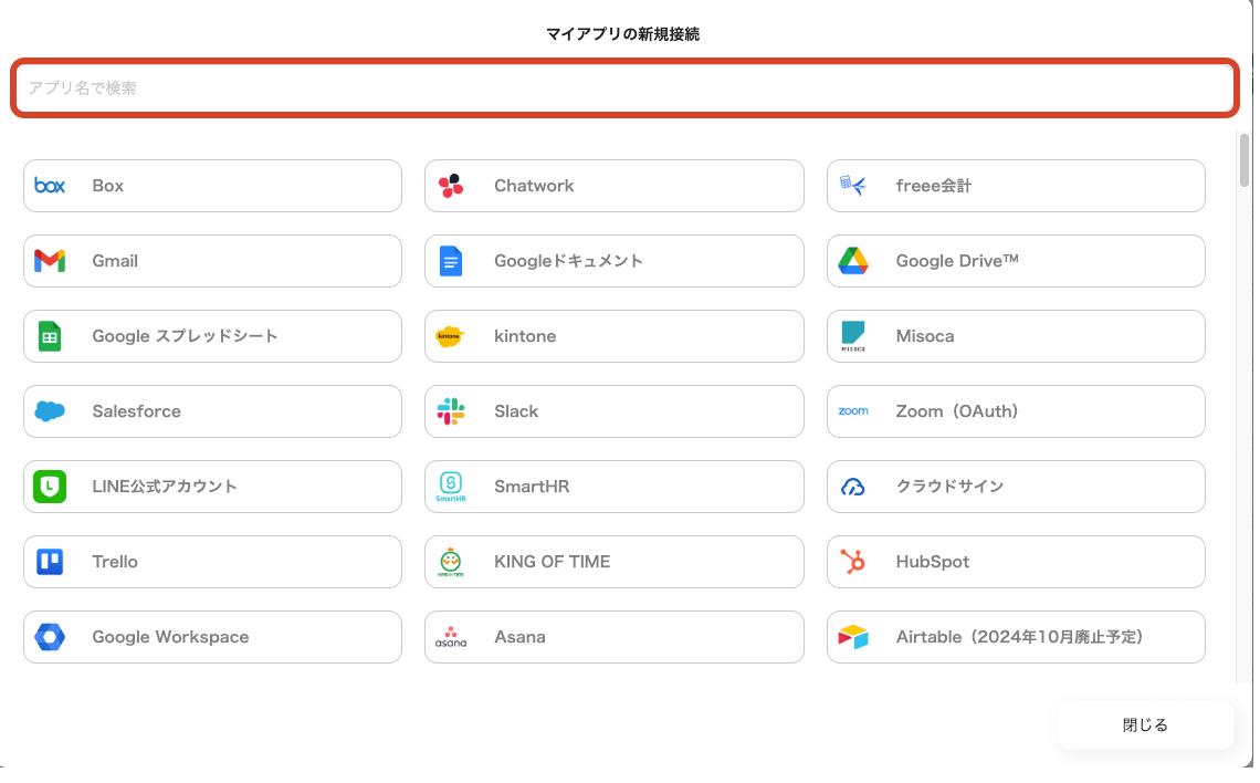 2)Yoomで接続可能なアプリ一覧が表示され、検索窓から1つずつアプリを検索します。