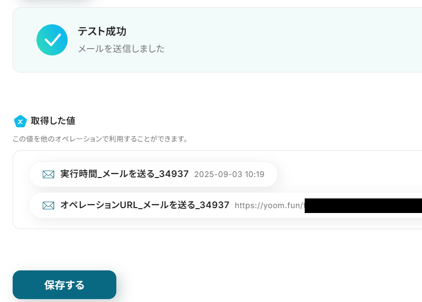 テストに成功すると以下のように表示され、取得した値(アウトプット)が出力されます。