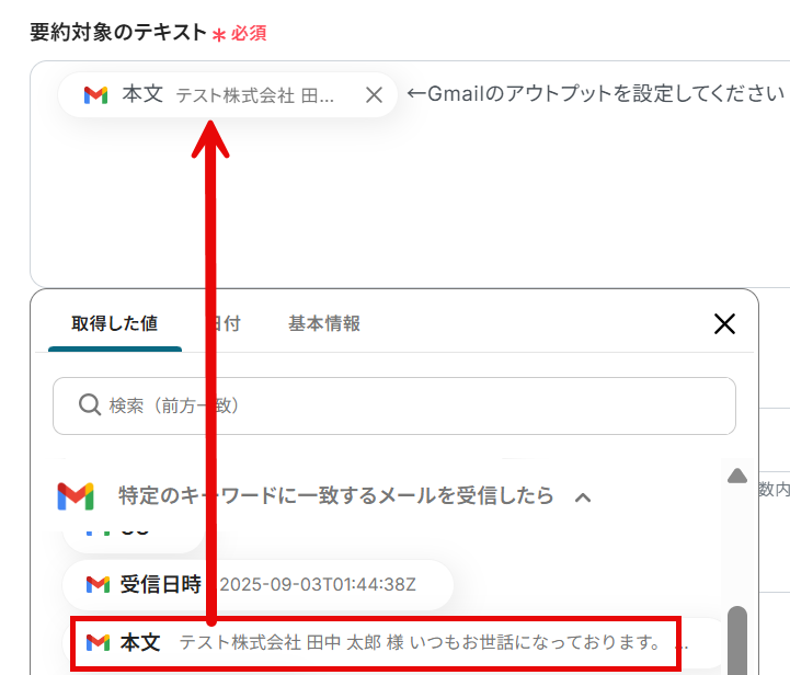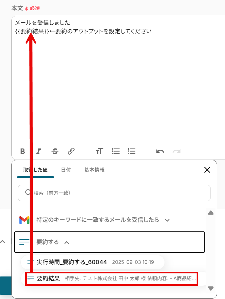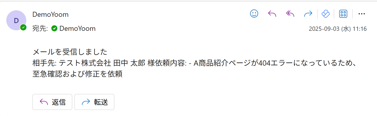 この連携は、AIによる要約のように受信データを加工して連携する処理の一例であり、長文メールの読解にかかる時間を削減します。
