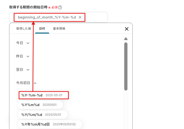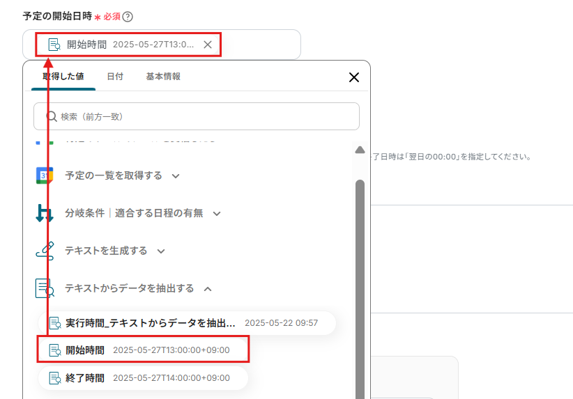 予定の開始日時は、取得した値から開始時間を選択してください。